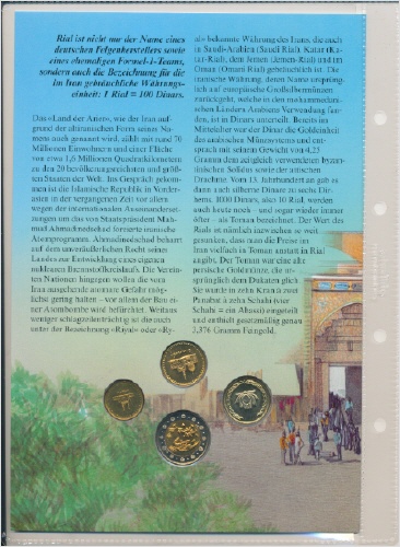 Münzen im farbigen Folder mit Beschrieb auf der Rückseite.