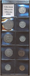 Der Münzsatz enthält einen Fünffränkler, Zweifränkler, Einfränkler, 50-Räppler, 20-, 10-, 5-, 2- und 1- Räppler.
