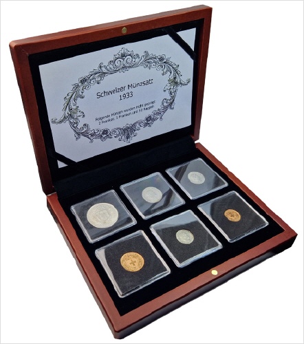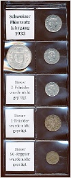 Der Münzsatz enthält einen Fünfliber, 20-Räppler, 10-Räppler, 5-, 2- und 1-Räppler.Zweifränkler, Einfränkler und 50-Räppler wurden in diesem Jahr nicht geprägt.