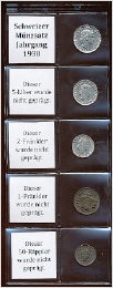 Der Münzsatz enthält einen 20-, 10-, 5-, 2- und 1-Räppler.Fünfliber, Zweifränkler, Einfränkler, 50-Räppler wurden in diesem Jahr nicht geprägt.