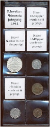 Der Münzsatz enthält einen Einfränkler, 50-Räppler, 5-, 2- und 1- Räppler.Fünfliber, Einfränkler, 20- und 10-Räppler wurden in diesem Jahr nicht geprägt.
