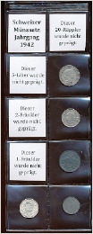 Der Münzsatz enthält einen 50-Räppler, 10-Räppler, 5-, 2- und 1-Räppler.Fünfliber, Zweifränkler, Einfränkler, 20-Räppler wurden in diesem Jahr nicht geprägt.