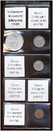 Der Münzsatz enthält einen Fünfliber, 10-, 5- und 1- Räppler.Es wurden keine Zweifränkler, Einfränkler, 50-Räppler, 20- und 2-Räppler geprägt.