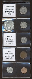 Der Münzsatz enthält einen Fünfliber, 50-Räppler, 20-, 10-, 5-, 2- und 1- Räppler.Es wurden keine Zweifränkler und Einfränkler geprägt.