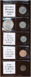 Der Münzsatz enthält einen Fünfliber, 20-Räppler, 10-Räppler, 5-, 2- und 1-Räppler.Zweifränkler, Einfränkler und 50-Räppler wurden in diesem Jahr nicht geprägt.