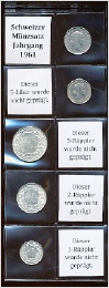 Der Münzsatz enthält einen Zweifränkler, Einfränkler, 50-Räppler, 20 Räppler, 10-Räppler.Fünfliber, 5-, 2- und 1-Räppler wurden in diesem Jahr nicht geprägt.