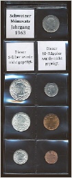 Der Münzsatz enthält einen Zweifränkler, Einfränkler, 50-Räppler, 20-, 5- und 1-Räppler.Fünfliber und 10 Räppler wurden nicht geprägt.