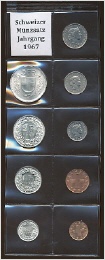 Der Münzsatz enthält einen Fünffränkler, Zweifränkler, Einfränkler, 50-Räppler, 20-, 10-, 5-, 2- und 1-Räppler.
