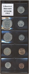 Der Münzsatz enthält einen Fünffränkler, Zweifränkler, Einfränkler, 50-Räppler, 20-, 10-, 5-, 2- und 1-Räppler.