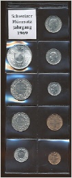 Der Münzsatz enthält einen Fünffränkler, Zweifränkler, Einfränkler, 50-Räppler, 20-, 10-, 5-, 2- und 1-Räppler.