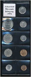 Der Münzsatz enthält einen Fünffränkler, Zweifränkler, Einfränkler, 50-Räppler, 20-, 10-, 5-, 2- und 1-Räppler.